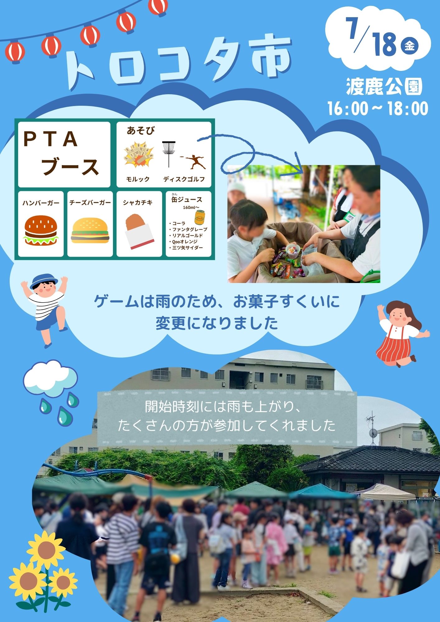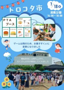 7月18日(金)雨が断続的に降る一日となりました。それに伴い、PTAブースはゲーム内容を変更したため、お手伝いは中止とさせていただきました。