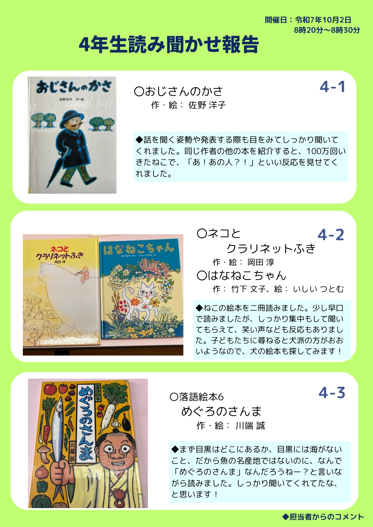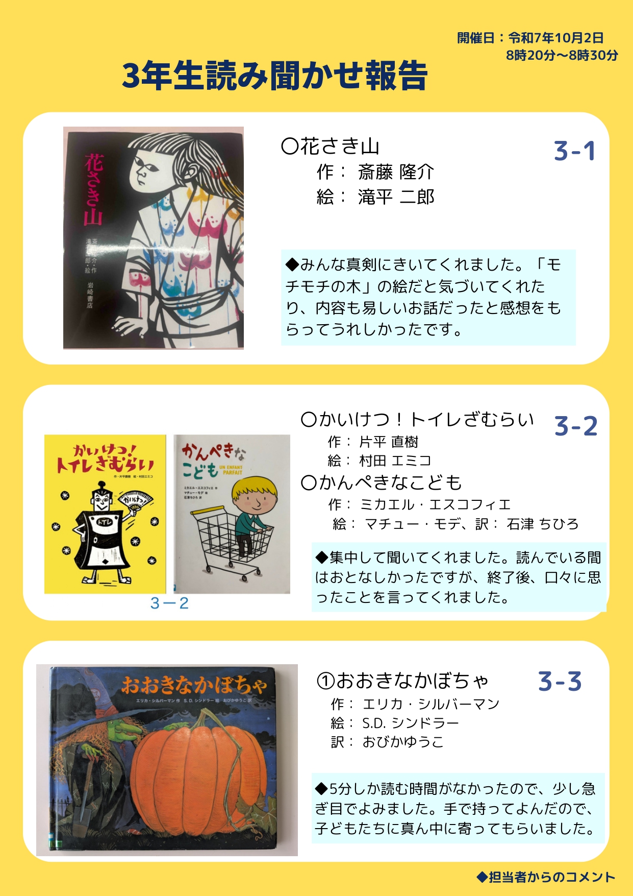 takusyouPTA2025年10月20日2025年10月20日 10月2日は3年生4年生の朝の読み聞かせがありました。 季節の本や、子どもたちになじみのある作者さんの本など、今回も多彩な本が並びました。読書の秋、ご家庭でも子どもたちと一緒に絵本ぜひ楽しんでください。 【3年生の報告】 【4年生の報告】
