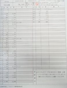 日頃よりベルマーク活動へのご協力ありがとうございます。ベルマーク財団より検収済の伝票が来ましたのでお知らせします。点数は74,585点12月に計算したのが74,580点でしたので、計算ミス少なくて良かったです。