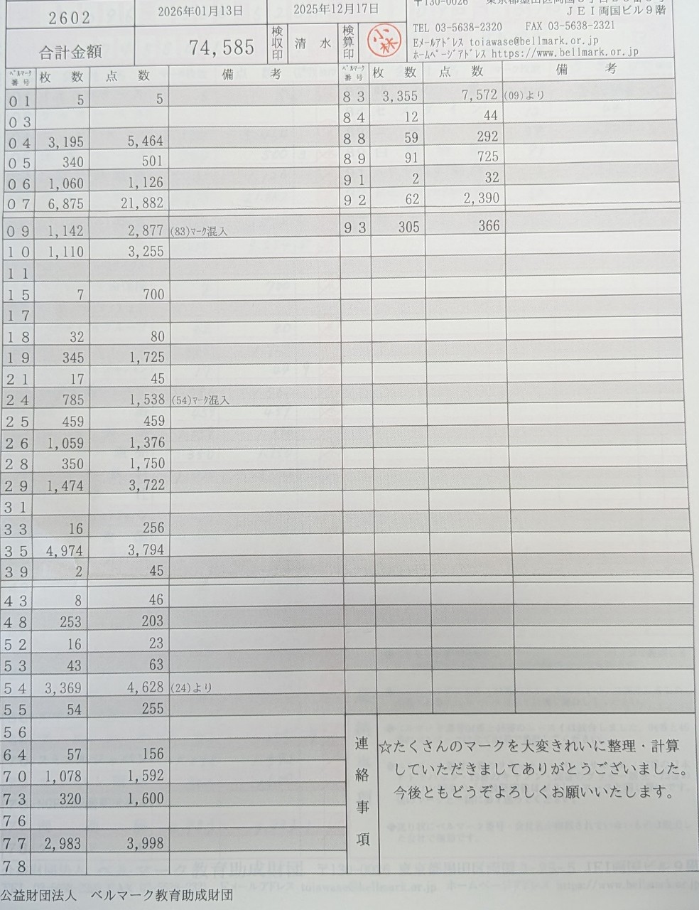 日頃よりベルマーク活動へのご協力ありがとうございます。ベルマーク財団より検収済の伝票が来ましたのでお知らせします。点数は74,585点12月に計算したのが74,580点でしたので、計算ミス少なくて良かったです。