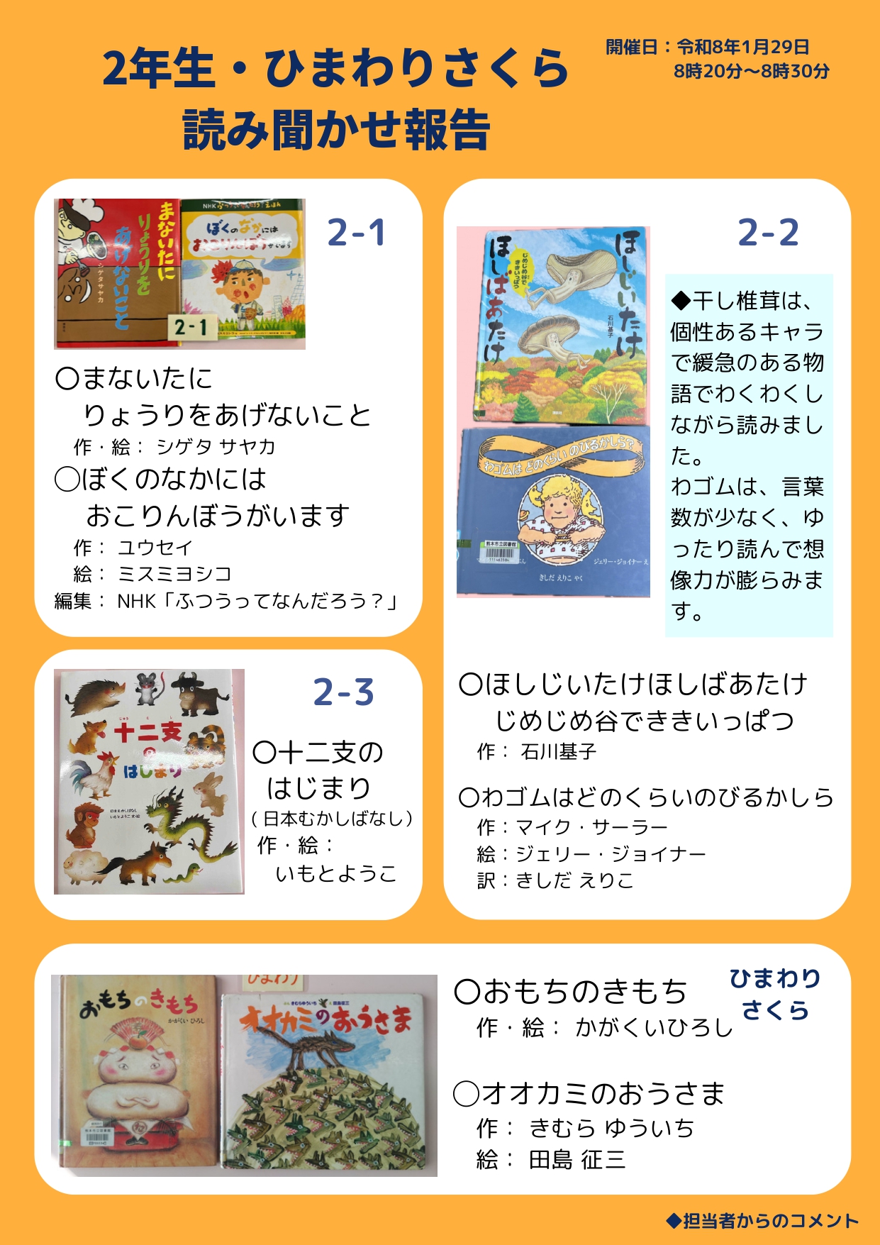 1月29日は2年生とひまわりさくらさんへの読み聞かせでした。読み聞かせの最中、クラスからは時折笑い声が聞こえてきます。楽しい時間を過ごしてくれたようです。