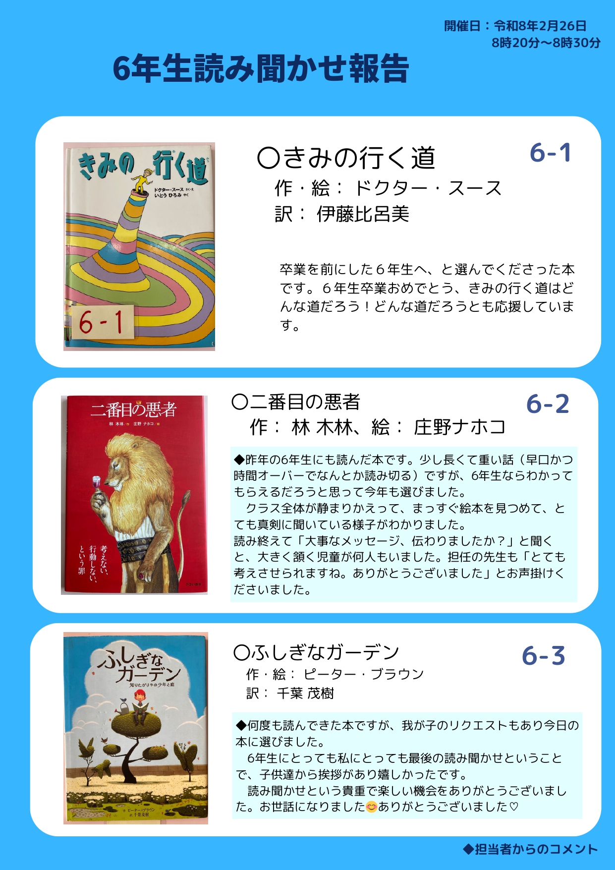 2月26日は6年生の読み聞かせでした。6年生は小学校最後の読み聞かせ。担当のみなさんは、卒業する6年生へのメッセージを絵本に込めて読み聞かせしてしてくださいました。6年生ご卒業おめでとうございます。